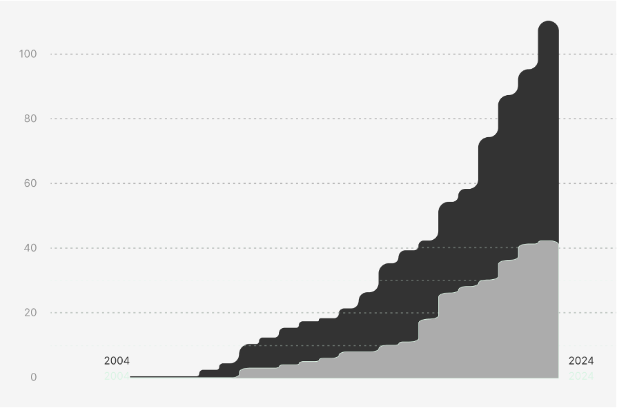 The challenge was to weave our lab’s story into this scenery. What data truly represents 20 years of VisLab? The answer had to be our publications and the students we’ve nurtured. I decided to create a chart of our publication output and graduation number from 2004 to 2024. The layered, undulating form of the chart immediately reminded me of the trees on the mountains. That was the key.